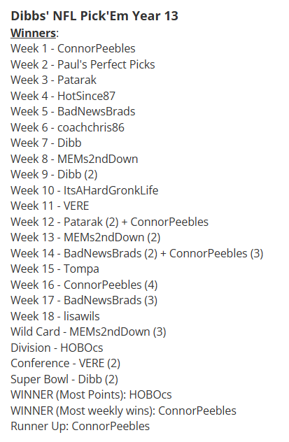 - Week 17 Winner: HOBOcs with 13 wins ($25.00)