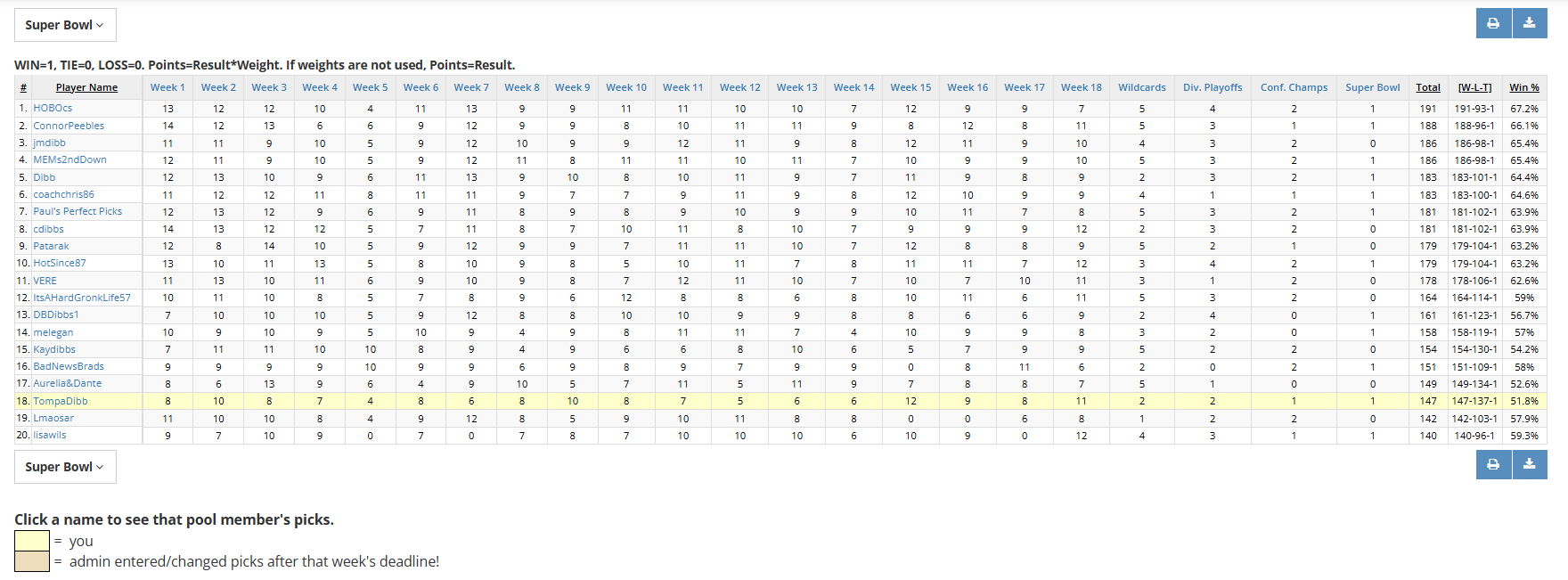 - Super Bowl Co-Winners: ConnorPeebles, melegan, jmdibb with 1 win ($8.33 each) Tiebreaker
